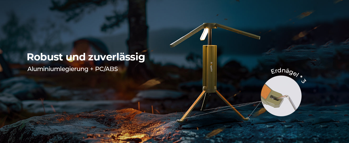 In der Regel werden Teleskop-Campinglampen mit wiederaufladbaren Batterien betrieben, oft mit USB-Lademöglichkeit. Die BougeRV-Campingleuchte verfügt über einen wiederaufladbaren, leistungsstarken 15600-mAh-Akku, der eine Betriebsdauer von bis zu 60 Stunden ermöglicht.