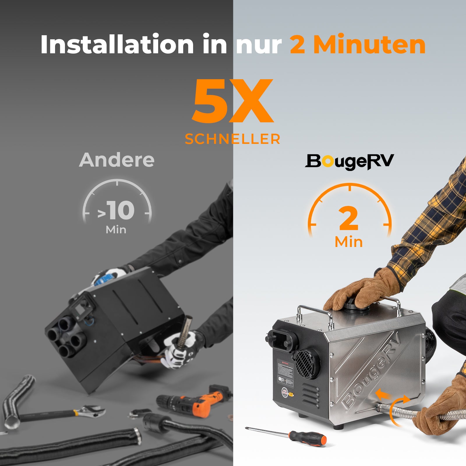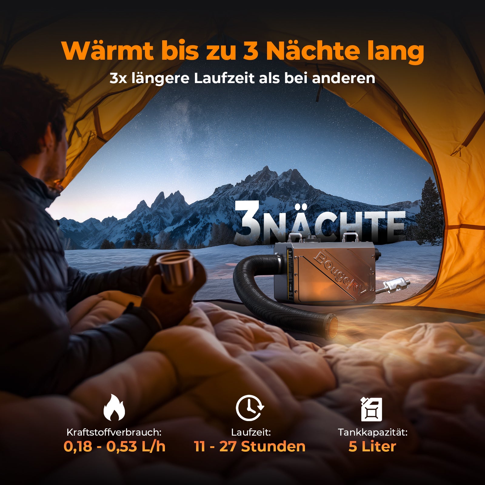 Mit einer leistungsstarken Heizleistung von 5 kW kann der tragbare Dieselheizstrahler BougeRV ein 3–4 m² großes Zelt in nur 10 Minuten aufheizen und sorgt so für gemütlichen Komfort in kalten Nächten. Dank seines kompakten, platzsparenden Designs lässt er sich in nur einer Minute aufstellen und kann somit überall problemlos installiert werden. Sie wurde mit Blick auf Sicherheit und Effizienz entwickelt und verfügt über einen Überhitzungs-, Spannungs- und Kurzschlussschutz, während sie nur 0,14–0,43 l/h Kraftstoff verbraucht und somit langlebig ist. Diese tragbare Dieselheizung eignet sich perfekt für Wintercamping, Roadtrips, Garagen oder Werkstätten und bietet leistungsstarke Wärme, leisen Betrieb und zuverlässige Effizienz.