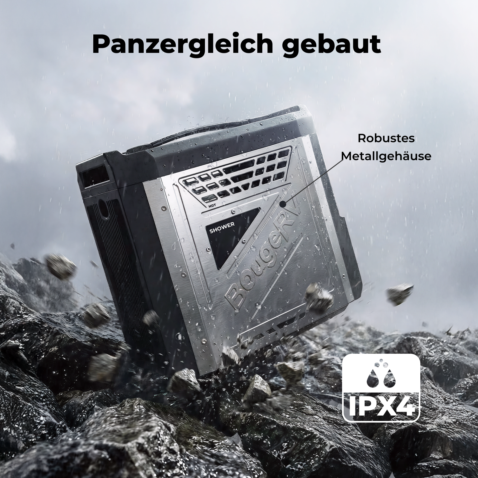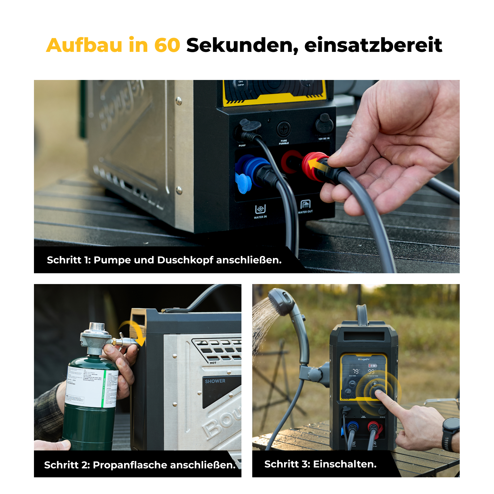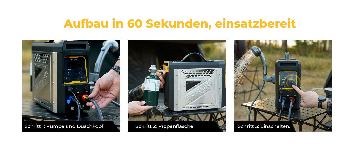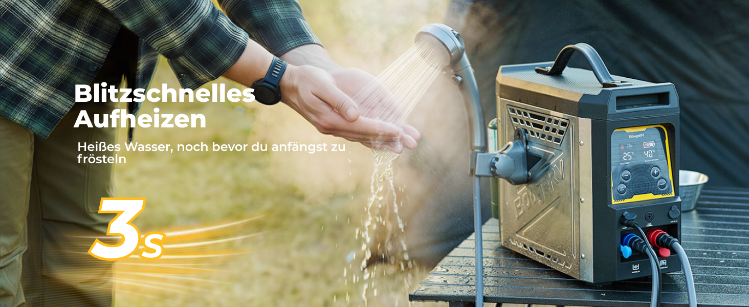 Er heizt in nur 3 Sekunden auf und ist in 60 Sekunden installiert – für echten Plug-and-Play-Komfort. Mit seinem robusten Metallgehäuse und seiner hohen Heizleistung sorgt BougeRV überall für zuverlässiges Warmwasser, egal wohin Ihr Abenteuer Sie führt – konstant, leistungsstark und langlebig.