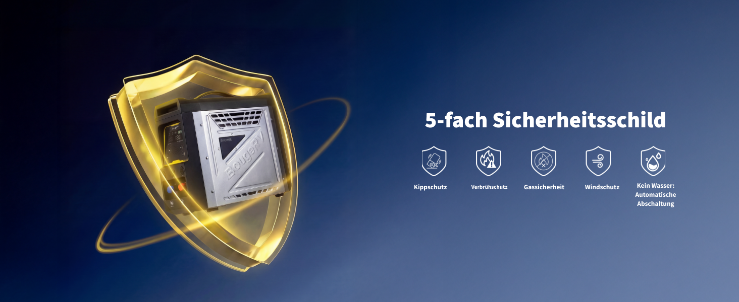Ja. Der Warmwasserbereiter verfügt über mehrere Sicherheitsvorrichtungen, darunter eine Flammenausfallabschaltung, einen Überhitzungsschutz, einen Kippschutz, eine Gassicherung und eine automatische Abschaltung, die einen sicheren Betrieb bei jeder Verwendung im Freien gewährleisten.