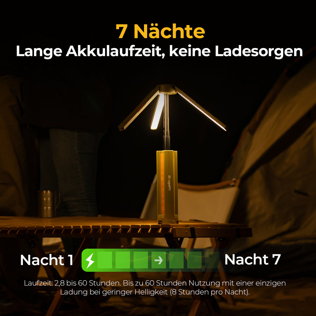 In der Regel werden Teleskop-Campinglampen mit wiederaufladbaren Batterien betrieben, oft mit USB-Lademöglichkeit. Die BougeRV-Campingleuchte verfügt über einen wiederaufladbaren, leistungsstarken 15600-mAh-Akku, der eine Betriebsdauer von bis zu 60 Stunden ermöglicht.