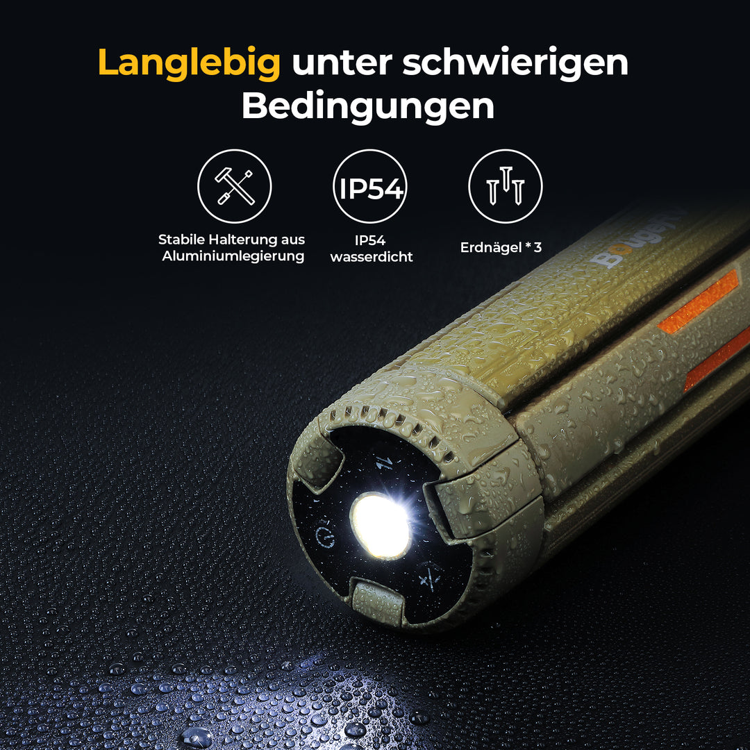 Ja, die wiederaufladbaren BougeRV-Campinglampen sind nach IP54 wasserdicht und somit für den Außeneinsatz geeignet.